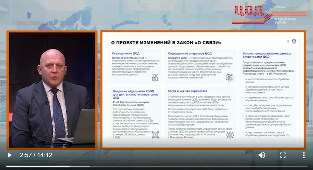 Параллельно ведется работа по усовершенствованию отраслевого законодательства. В ноябре 2020 г. ведомство направило в правительство проект поправок в Федеральный закон «О связи». Они, в частности, должны дать определение ЦОДам, зафиксировать их правовой статус, а также перечень сведений, которые операторы ЦОДов должны предоставлять в информационную систему министерства. «Буквально на днях были предложены новые поправки, поэтому я не берусь прогнозировать, когда законопроект будет принят, подписан и вступит в силу», – отметил И. Семенихин.