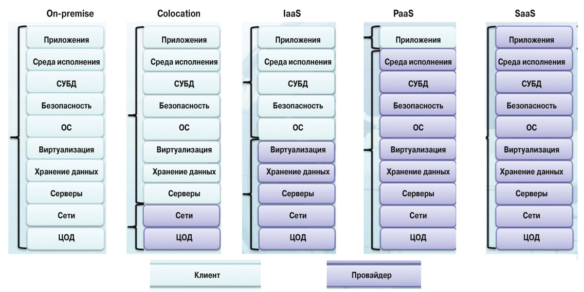 Рис. 1. Зоны ответственности клиента и облачного провайдера при разных моделях использования ИТ-инфраструктуры