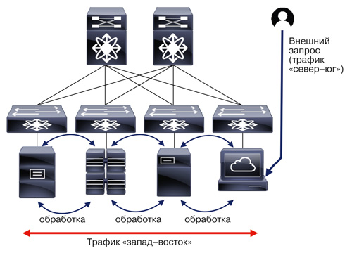 Объем трафика, циркулирующего внутри ЦОДа, т.е. между коммутаторами внутри сети (так называемый трафик «запад – восток»), существенно превосходит объем внешнего трафика – между ЦОДом и потребителями его сервисов (трафик «север – юг») (рис. 2). Главная причина такого доминирования – особенности архитектуры приложений, которые обычно разворачиваются на оборудовании, размещенном в ЦОДе. Например, пользователь, заходя на сайт, хостинг которого обеспечивает ЦОД, порождает всего один внешний запрос к веб-серверу (трафик «север – юг»). Но внутри ЦОДа он создает целый набор подключений: от балансировщика нагрузки к серверу front-end, от него к серверу back-end, от того к базе данных и обратно (трафик «запад – восток»).