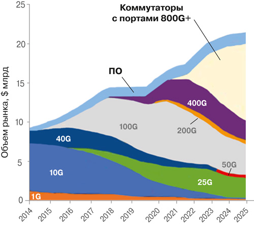 Рис. 5. Объем и структура рынка коммутаторов Ethernet для ЦОДов