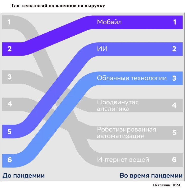 Пандемия продемонстрировала слабость человеческого звена в бизнес-цепочках и еще больше повысила интерес к решениям на основе искусственного интеллекта (ИИ), прежде всего к тем, которые предоставляются по сервисной модели. По данным IBM, до пандемии облачные технологии в рейтинге влияния на бизнес занимали шестое место, а ИИ – пятое. Теперь ИИ и облачные технологии попали в призовую тройку, уступая только мобильным технологиям (рис. 1).