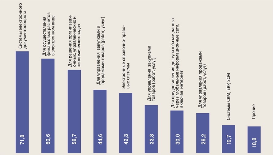 Для гостиничного бизнеса и общепита значимы также автоматизированные системы, позволяющие управлять закупками и продажами, электронные справочные правовые системы. Для компаний, оказывающих туристические услуги, подобные сервисы менее важны. Стоит отметить, что только пятая часть компаний отрасли использует CRM (см. рисунок), хотя работа с клиентами – основа туристического бизнеса.
