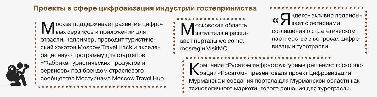 Подготовка и запуск национального проекта усилили интерес разных компаний и организаций к индустрии гостеприимства. В 2020–2021 гг. участники этого рынка заметно активизировали свою деятельность в направлении цифровизации туристической отрасли и управления ею на основе данных. Обсуждается вопрос о создании цифрового профиля региона и цифрового профиля туриста – инструментов, которые позволят эффективно управлять индустрией.