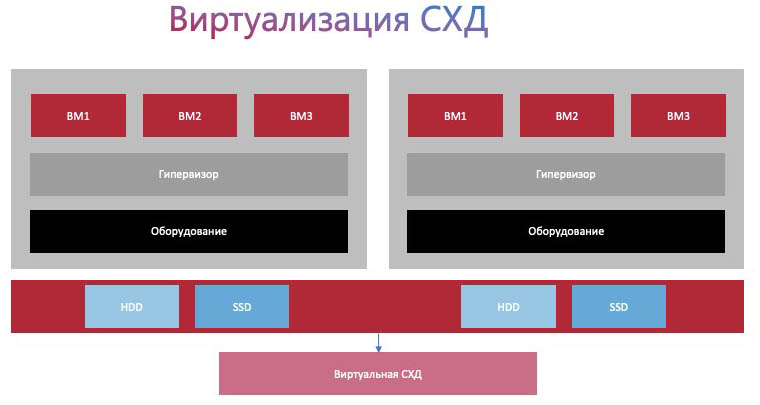 Виртуализация серверов (рис. 1) позволяет работать c виртуальными ресурсами: центральным процессором (vCPU), оперативной памятью (vMEM), жесткими дисками (vHDD), сетевыми интерфейсами (vNIC), шиной PCI, графическим процессором (vGPU), строить отказоустойчивые кластеры, делать снимки состояния, динамически управлять ресурсами виртуальной машины (ВМ), работать с ними в графическом или консольном режиме, а также по технологии VDI и 3D VDI. Виртуализация СХД дает возможность гибкого управления данными ВМ, а также обеспечивает отказоустойчивость и производительность любого уровня.