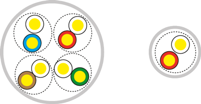 Рис. 1. Поперечное сечение неэкранированных горизонтальных кабелей СКС: четырехпарного (слева) и однопарного (справа)