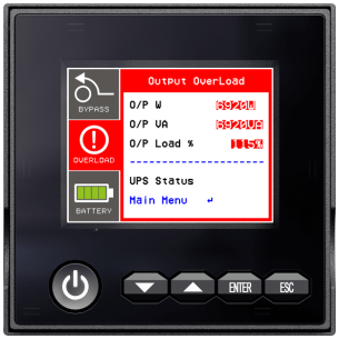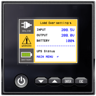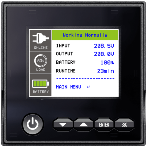 Устройства оснащены полнофункциональной ЖК-панелью управления, которая дает возможность провести их настройку и в режиме реального времени ознакомиться с основными параметрами: процентом нагрузки, показателями состояния сети, батарей и т.п. ЖК-панель относится к новому классу современных полноцветных матриц, поддерживающих цветовую кодировку. Цветовая кодировка позволяет оценить состояние ИБП даже без детального изучения показателей: зеленым подсвечивается штатная работа, желтым – работа от батарей, красным – перегрузка. При установке ИБП в стойку (горизонтально) или на пол (вертикально) экран автоматически поворачивается, а для более удобного просмотра при горизонтальном расположении ИБП экран можно наклонить до 18 град. (рис. 3).