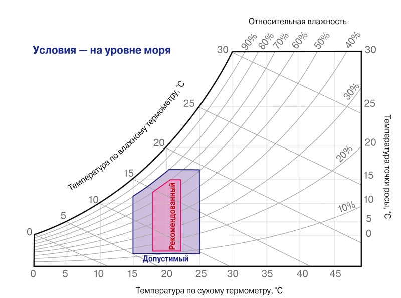 Если же скорость образования коррозионного слоя в ЦОДе не измеряется, ASHRAE рекомендует ограничить относительную влажность 50%. Немного странно, что при этом допускается следовать уставкам, предусмотренным в предыдущей, четвертой редакции Рекомендаций, в которой значение относительной влажности ограничивалось 60%.