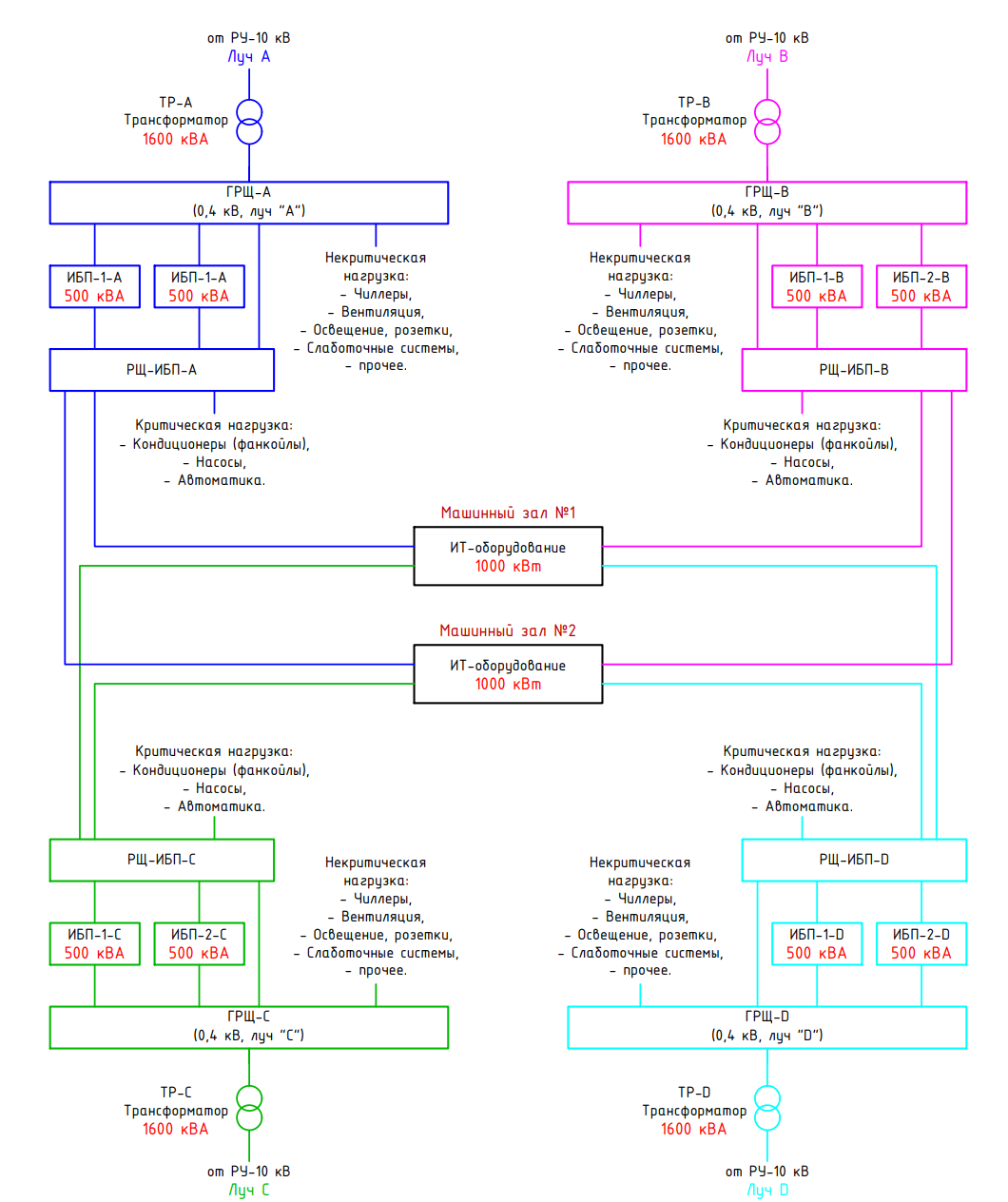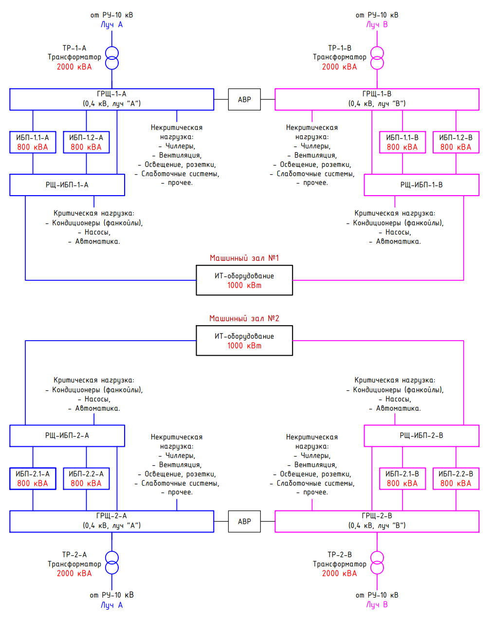 Рис. 5. Схема электропитания двух машинных залов по топологии 2N