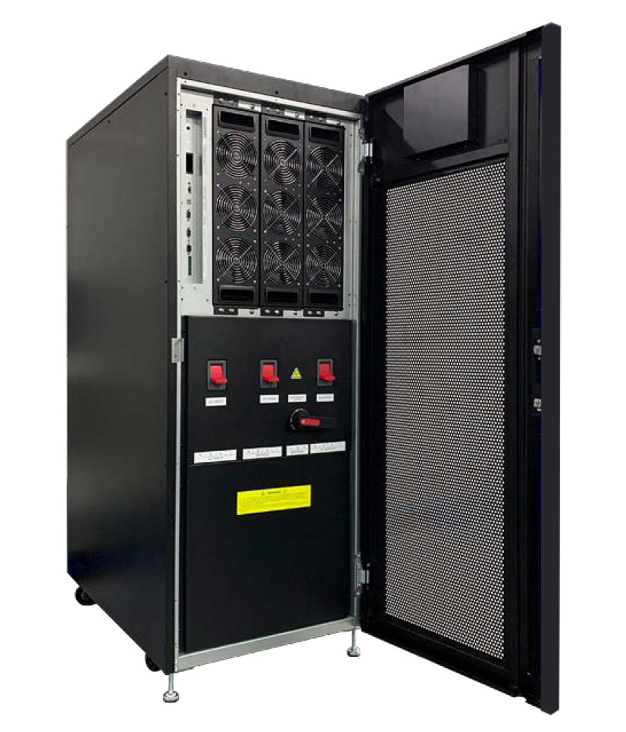 Одним из наилучших решений для ЦОДов на сегодня являются ИБП серии Innova Modular. Эти источники построены на основе компактных (высотой 3U) силовых блоков 25 кВт (коэффициент мощности равен 1). Имеются два варианта 19-дюймового конструктива: шкаф на три силовых модуля и шкаф на восемь модулей – мощностью 75 и 200 кВт соответственно. В параллель можно установить до четырех шкафов. Кроме того, при объединении через общий байпасный шкаф в единую систему можно собрать до восьми шкафов. Максимальная мощность составит 1,6 МВт. Столь широкий диапазон поддерживаемой мощности позволяет построить систему бесперебойного электропитания для ЦОДа практически любого масштаба.