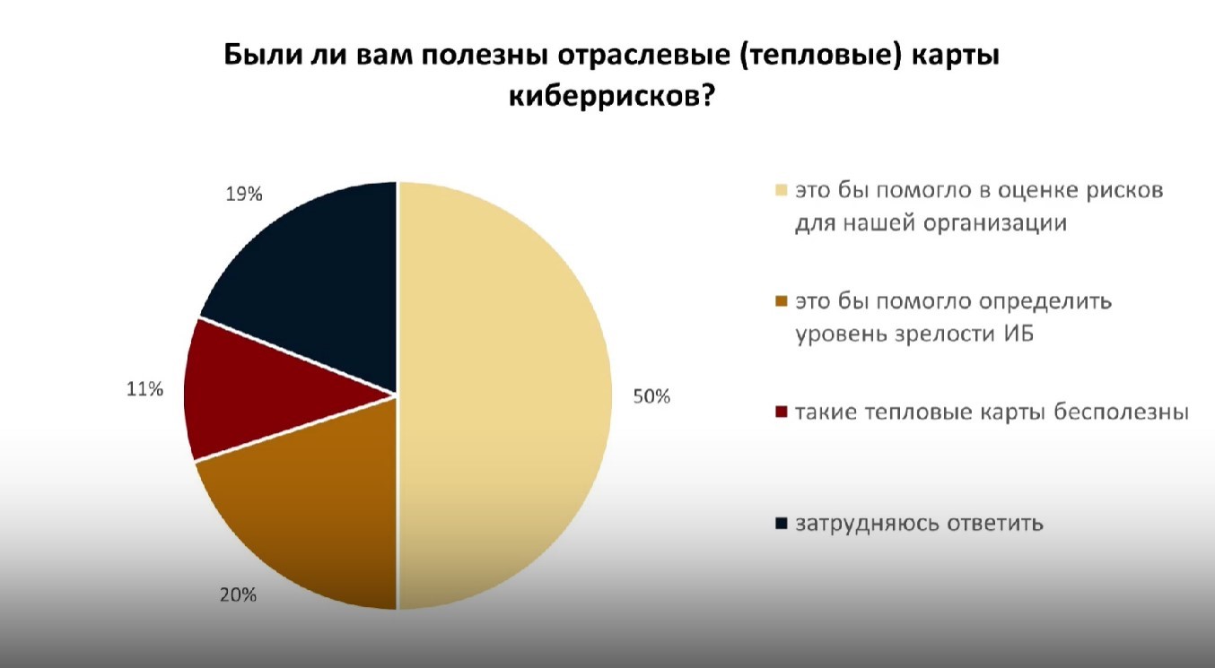 Разработка тепловых карт киберрисков ведется и в России. Между тем Евгений Сачков, эксперт по управлению рисками компании «Информзащита», к оценке вероятности недопустимых событий отнесся скептически, указав, что такие события зависят не только от отрасли, но и от популярности компании, ее активности в медийном поле, проработанности системы защиты и т.п. По его мнению, оценивать риски для конкретной компании следует с помощью не обобщенных тепловых карт, а специальных систем на основе факторного анализа для статистического моделирования и оценки ущерба в денежном эквиваленте. Однако большинство слушателей с этим не согласилось. Половина опрошенных сочла, что отраслевые тепловые карты киберрисков помогли бы оценить риски их организаций, по крайней мере в первом приближении (рис. 3). Ведь не все компании имеют соответствующую экспертизу и могут провести более точный анализ.