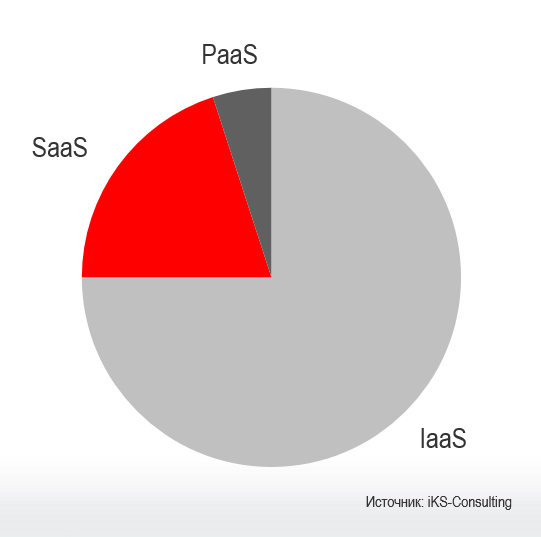 Три четверти объема облачного рынка в стране приходится на инфраструктурные услуги (IaaS, рис. 4). В оставшейся четверти доминирует SaaS. В этом сегменте в основном присутствуют локализованные версии зарубежных продуктов и используются агентские модели продаж. Невысокое потребление услуг PaaS аналитики связывают с незначительным объемом местных разработок. Но в целом структура запросов на облачные сервисы усложняется. Растет спрос на услуги безопасности, резервного копирования и хранения данных.