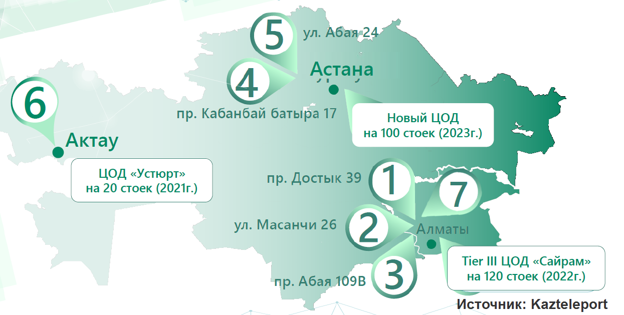 «Казтелепорт», располагающий сетью из семи ЦОДов (в Алматы, Астане и Актау, рис. 3), в 2022 г. запустил новый ЦОД «Сайрам» в Алматы. Объект рассчитан на 120 стоек (мощность каждой до 6 кВт) и примечателен тем, что это первый коммерческий ЦОД в Казахстане, который получил сертификат Tier III Facility от Uptime Institute. В системе бесперебойного электропитания ЦОДа «Сайрам» применяются литий-ионные батареи, способные обеспечивать его работоспособность до 20 мин, а расчетный коэффициент энергоэффективности (PUE) не превышает 1,2.