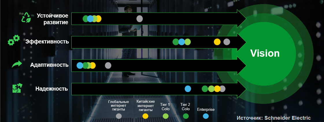 Эксперт Schneider Electric считает, что будущее ЦОДов будут определять четыре вектора: устойчивое развитие, повышение эффективности, адаптивности и надежности (рис. 5). На данным момент строители ЦОДов думают прежде всего об эффективности и надежности. Но все больше компаний начинают обращать внимание на устойчивое развитие, которое предполагает выработку углеродной стратегии, оптимизацию управления ресурсами, применение возобновляемых источников энергии и перерабатываемых материалов, включая аккумуляторные батареи. Важна и адаптивность: гибкость в проектировании, развертывании и обслуживании, совместимость с ИТ-системами следующего поколения, внедрение программно-определяемых систем и активное управление энергией.