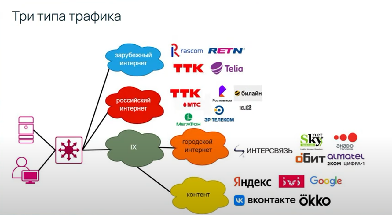 Среди сегментов Сети эксперт выделил зарубежный, российский, городской интернет и контент-провайдеров. Доступ к российскому сегменту интернета обеспечивают российские федеральные операторы, такие как «Ростелеком», ТТК, МТС и т.д., к зарубежному – международный магистральный оператор связи RETN, шведская телекоммуникационная компания Telia, российская «Раском» и др. В качестве примера городских интернет-компаний можно назвать московские «Интерсвязь» и «Акадо Телеком», красногорский «АйПильсин», питерский «Обит». Все они предоставляют клиентам широкополосный доступ в интернет. Крупнейшие контент-провайдеры — «Яндекс», Google, IVI, «Вконтакте», Okko — обеспечивают поиск, общение в соцсетях, показ фильмов, заказ такси, предлагают разные другие услуги.