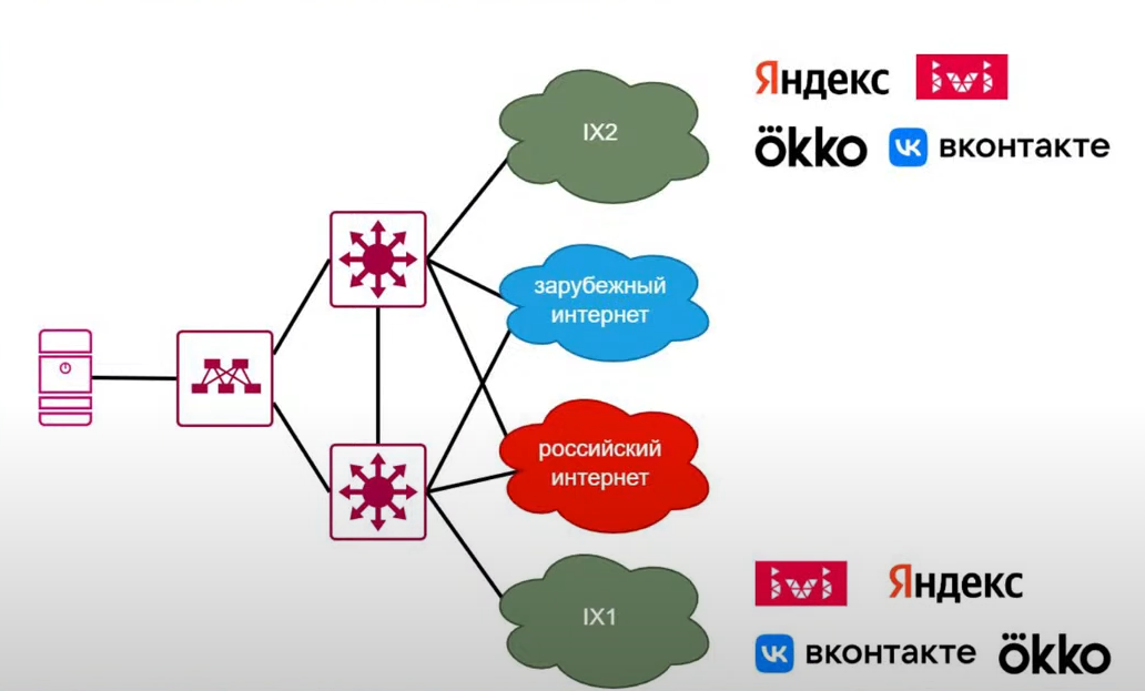 По мнению К. Малеванова, идеальный вариант для облачного провайдера — на двух обеспечивающих резервирование пограничных маршрутизаторах (area border router, ABR) организовывать линки ко всем интернет-провайдерам: два — к российским, два — к зарубежным и два линка к разным точкам обмена трафиком.