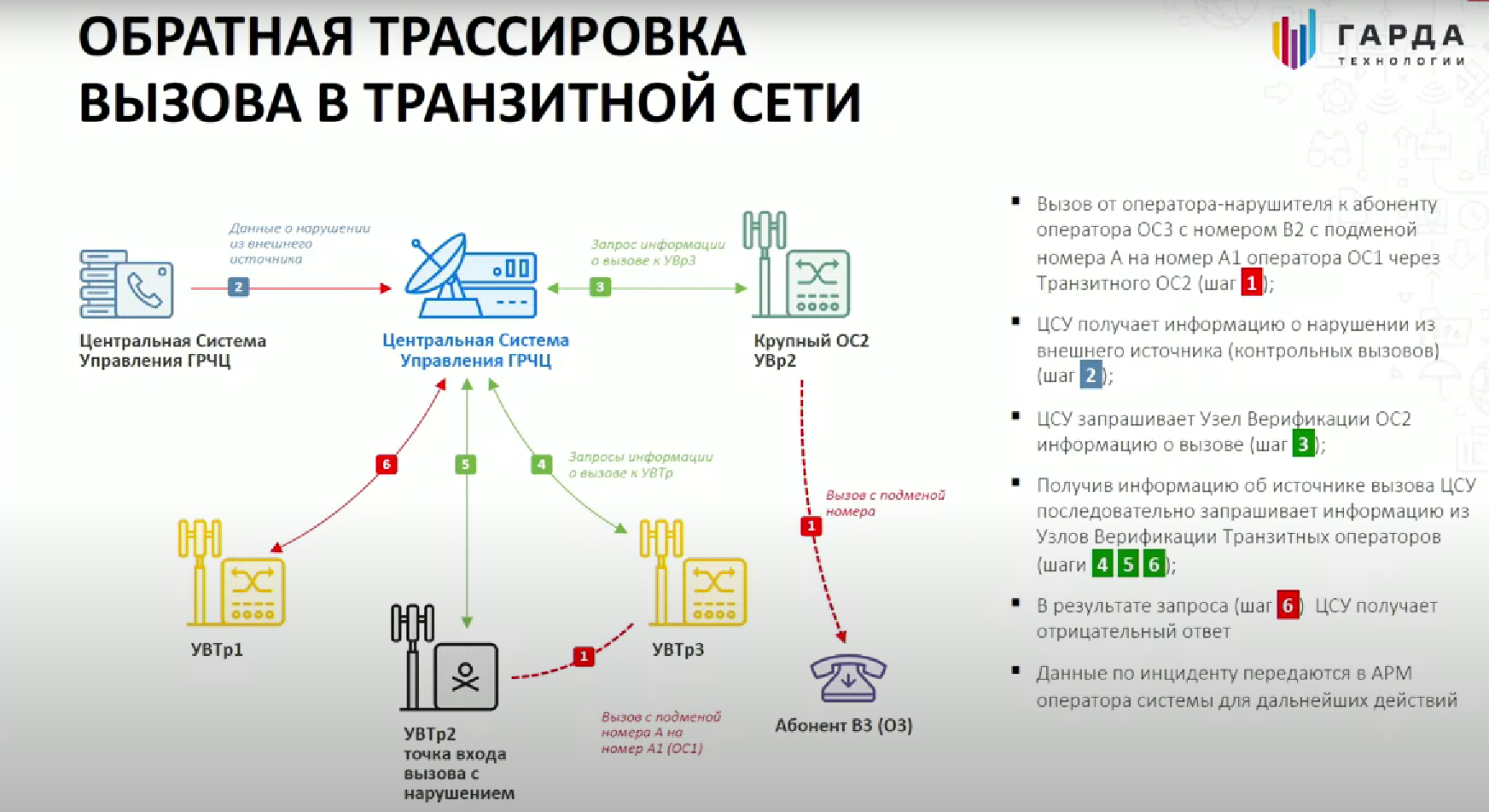 Чтобы построить маршрут прохождения вызова, ЦСУ в автоматическом режиме по цепочке запрашивает в обратную сторону от оператора вызываемого абонента все узлы верификации. Поскольку оборудование транзитных сетей в силу технических особенностей передает информацию о вызове в базы операторов с большой (но не превышающей 6 ч) задержкой, процедура опроса начинается через 6 ч. Место обрыва цепочки – точка входа нарушителя, подменившего номер. Данные об этом опять-таки в автоматическом режиме передаются в региональное отделение Роскомнадзора для выполнения контрольно-надзорных действий.