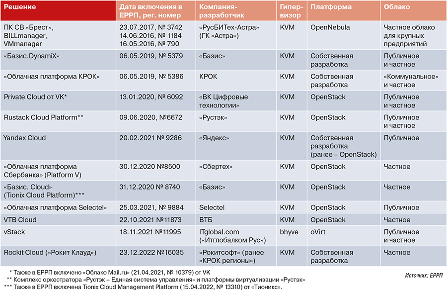 Целый ряд стратегий поведения российских компаний после ухода с рынка ведущих зарубежных вендоров предусматривает переход на отечественные облачные платформы. Таковые широко представлены в Едином реестре российских программ для ЭВМ и баз данных (ЕРРП). Отфильтруем решения в реестре по основному коду 02.03 («Средства обеспечения облачных и распределенных вычислений») классификатора ПО, утвержденного приказом Минцифры России от 22.09.2020 № 486. Добавим решения с кодом 02.05 («Средства обеспечения облачных и распределенных вычислений, средства виртуализации и системы хранения данных») из более старого, но еще действующего классификатора, утвержденного приказом от 31.12.2015 № 621. К ним добавим «Облачную платформу ВТБ» (VTB Cloud), по непонятной причине попавшую в классификатор с другим кодом. Оставим для рассмотрения только предлагаемые на рынке инфраструктурные облачные платформы, имеющие известные внедрения, с учетом прошедших слияний, поглощений и переименований (табл. 1).