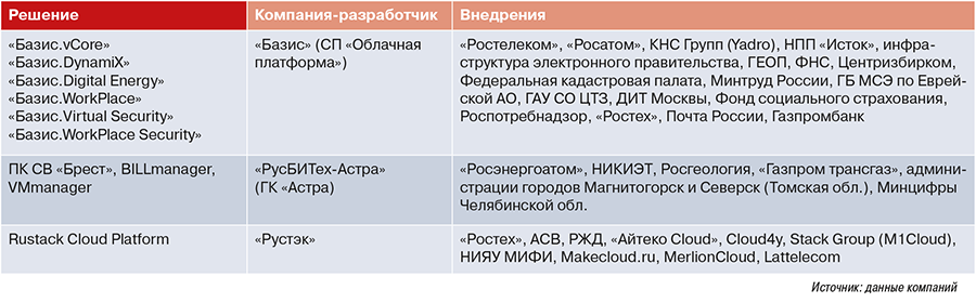 Табл. 2. Наиболее известные внедрения российских облачных платформ