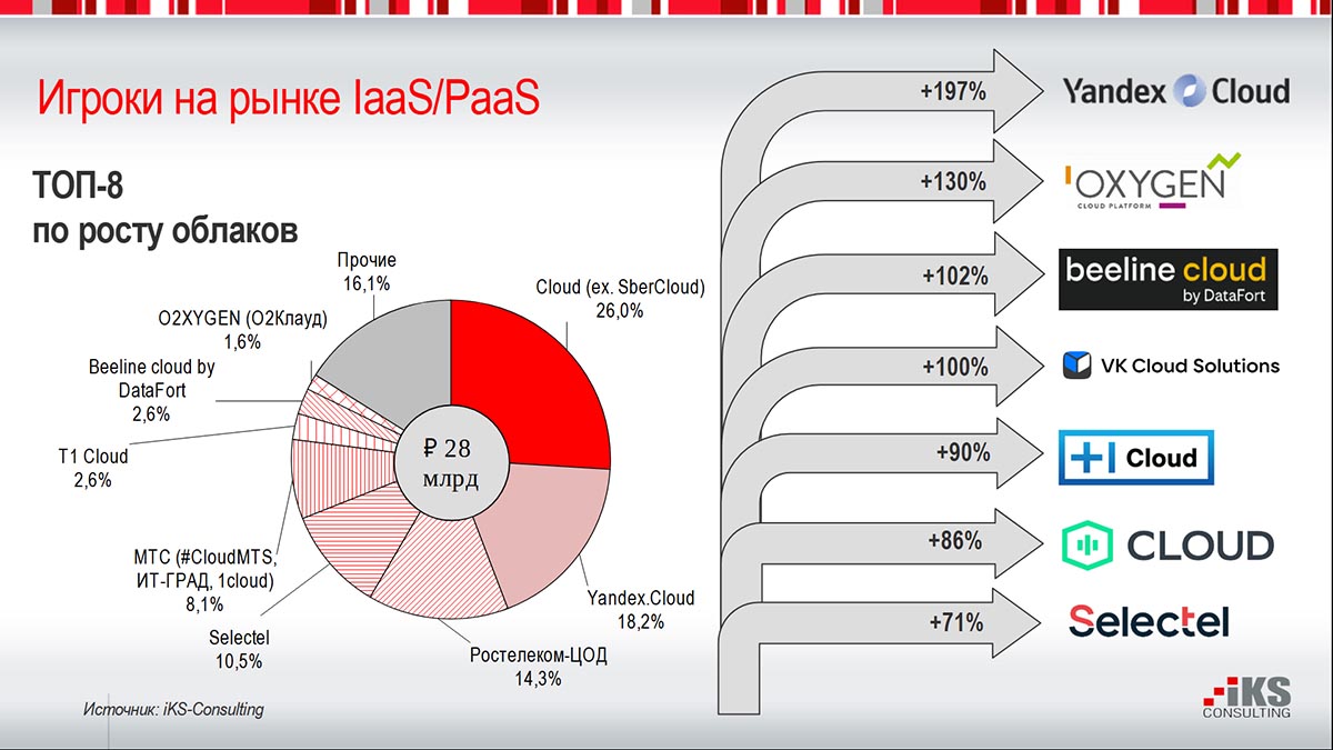Крупные провайдеры серьезно занялись рынком облачных услуг. Объем рынка увеличился на 28,1 млрд руб., и более половины этой суммы обеспечили три компании: Cloud (ранее SberCloud) – 26%, Yandex.Cloud – 18,2%, «Ростелеком-ЦОД» – 14,3%. Почти трехкратный рост продемонстрировала Yandex.Cloud, на 130% выросла выручка у Oxygen, удвоилась у Beeline и VK.