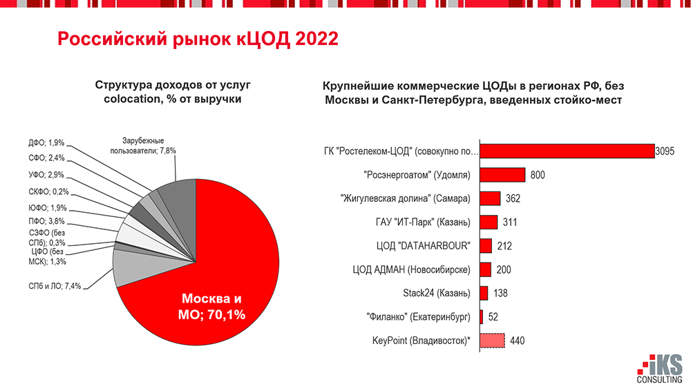 По данным iKS-Consulting, Приволжский федеральный округ в 2022 г. сохранил третье после двух столиц место по доходам от услуг сolocation на российском рынке коммерческих ЦОДов (3,8%), однако к нему подтягиваются УФО (2,9%), СФО (2,4%) и ДФО (1,9%).
