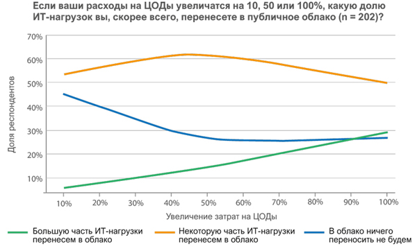 Рис. 1. Вероятная доля рабочих ИТ-нагрузок, которые будут перенесены в облако при росте затрат на ЦОДы