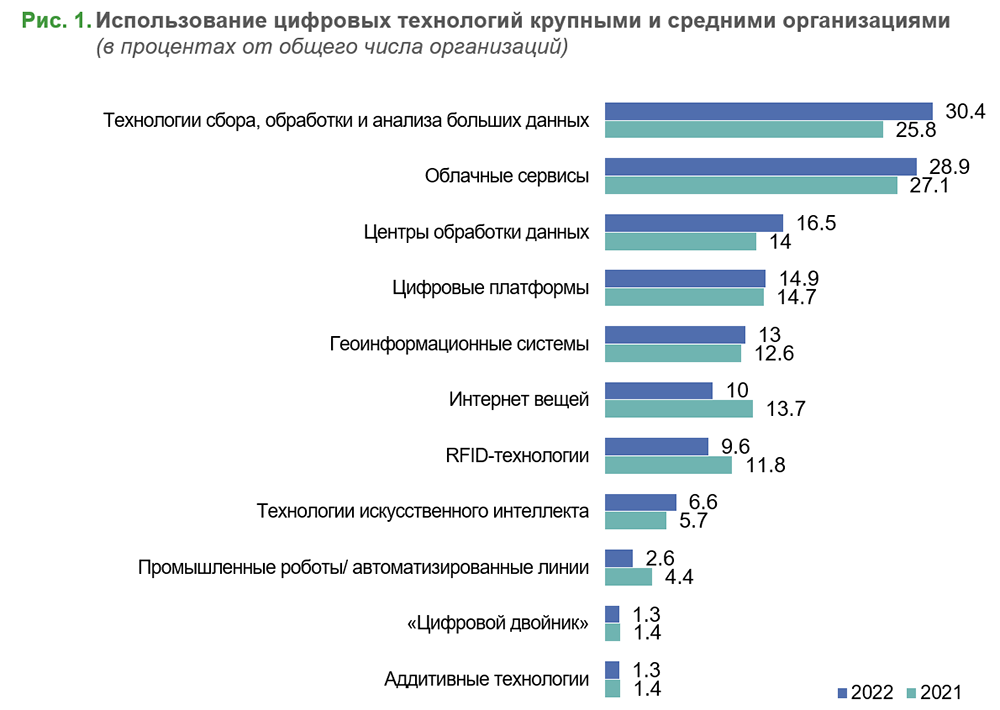 - Эти две технологии, а также центры обработки данных показали и максимальную годовую динамику распространения (прирост 4,6, 1,8 и 2,5 п.п. к 2021 г. соответственно).