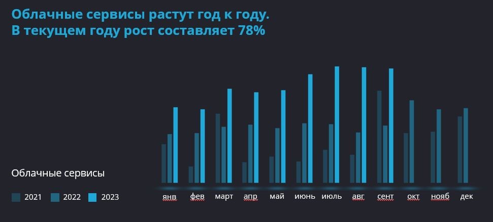 Развивается и облачный рынок – iKS-Consulting оценивает рост в 50%, причем инфраструктурные сервисы (IaaS/PaaS) доминируют над SaaS. У отдельных игроков рост значительно превышает средний показатель. Так, согласно данным компании PS Cloud Services, ее показатели текущего года существенно превосходят показатели 2021–2022 гг., а доходы от предоставления облачных сервисов в 2023 г. Увеличатся на 78%. Этот казахстанский провайдер предоставляет услуги, используя шесть ЦОДов, четыре из которых расположены в Алматы и по одному – в Астане и в Ташкенте (Узбекистан).