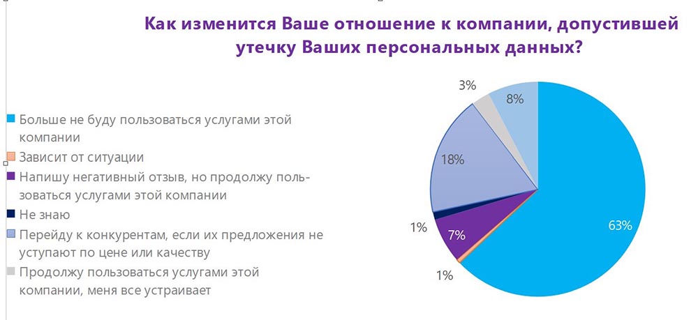 Тем не менее пассивность пользователей не означает, что их озабоченность безболезненна для бизнеса. 63% опрошенных заявили, что больше не будут пользоваться услугами компании, допустившей утечку их персональных данных. Так что и без усиления регуляторного давления стимул к улучшению защиты ПДн у бизнеса