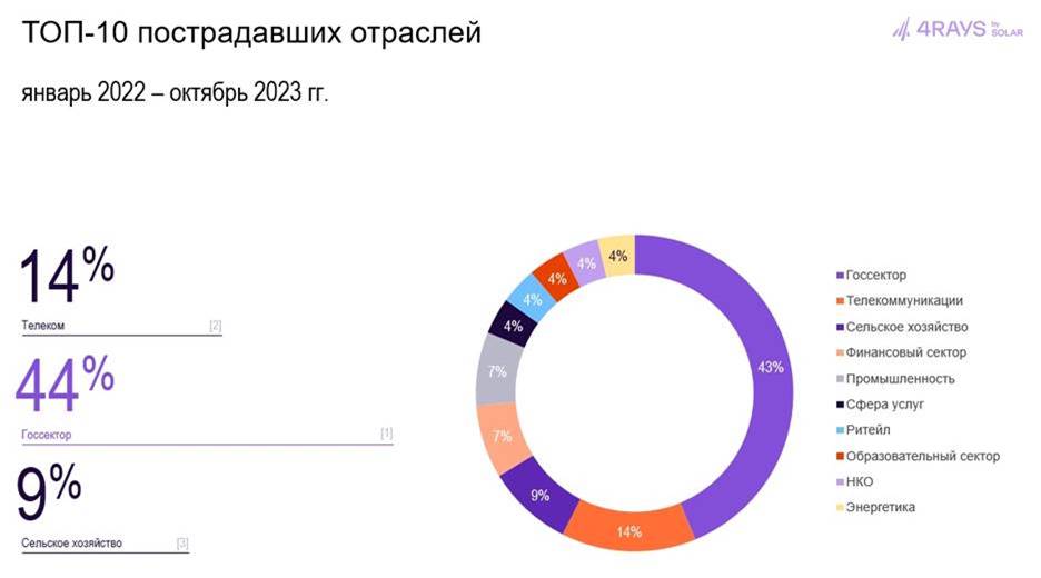 В ходе SOC-Forum 2023 эксперты ГК «Солар» назвали ТОП-10 наиболее пострадавших от хакеров отраслей за 2022-2023 гг. Большинство кибератак пришлось на государственные организации (44%) и телеком (14%), а также сельское хозяйство (9%) – последнее можно объяснить близостью отрасли к государству. Также в рейтинг попали промышленность (7%), финансовый сектор (7%), и с равными долями в 4% ритейл, сфера услуг, образование, НКО и энергетика.