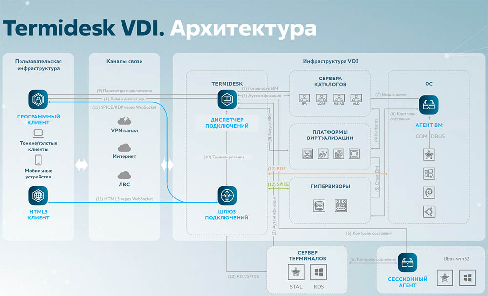 В рамках данного продукта вендор предлагает использовать гипервизор собственной разработки и брокер соединений, с помощью которого можно подключаться к ВМ с Windows и Linux. Выделенного терминального сервера в решении нет. Поддерживаются протоколы SPICE и RDP.