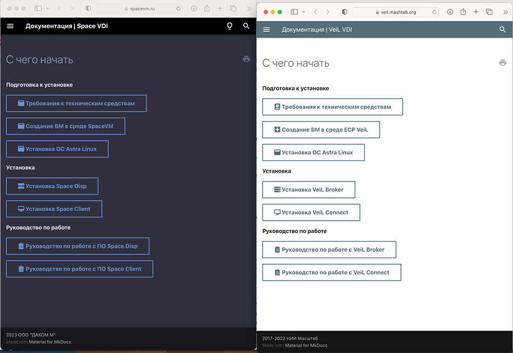 Рис. 9. Сравнение порталов с документацией решений Space VDI и Veil VDI
