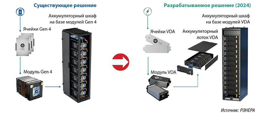 Как подчеркнул представитель РЭНЕРА, важно, особенно в нынешних условиях, что все патенты зарегистрированы в РФ, компания владеет технологией и сейчас ее локализует в России. Сегодня базовый продукт – литий-ионные ячейки четвертого поколения (Gen 4) для электротранспорта и систем накопления электроэнергии (рис. 3). Ячейки собираются в модуль, а из модулей строится готовое решение, например батарейный шкаф, который интегрируется с ИБП. К концу года в производство будет запущена ячейка нового поколения c большей объемной энергоемкостью. Именно эти ячейки (VDA) будут производиться на гигафабрике в Калининграде.