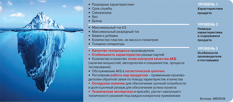 По словам эксперта ENERGON, покупатели, как правило, интересуются параметрами первого уровня (рис. 2) – разрядными характеристиками, сроком службы, саморазрядом, весом, – которые у всех поставщиков более или менее одинаковы. Но это только верхушка айсберга, определяющего качество и надежность функционирования АКБ.