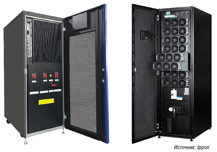 Даже ИБП, которые формально относятся к моноблочным, внутри – модульные. Пример такого решения представила компания Ippon. Innova RT II 33 – трехфазный моноблочный ИБП (70–210 кВт, до 840 кВт в параллельной системе) с модульной архитектурой. «Заказав фрейм, можно установить (в него) один модуль на 75 кВт. При увеличении нагрузки можно добавить модули, но не в “горячем” режиме. Модульность помогает в обслуживании, позволяет унифицировать модельный ряд и ЗИП. Можно изъять необходимый модуль и провести с ним работу», – объяснил Алексей Лобов, директор по развитию бизнеса трехфазных ИБП компании Ippon. По сути, главное отличие такого ИБП от настоящего модульного – отсутствие возможности «горячей» замены модулей (рис. 4).