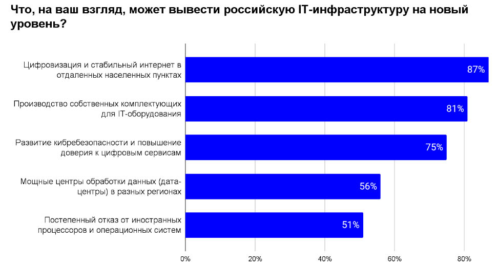 Отвечая на вопрос о том, что может вывести российскую IT-инфраструктуру на новый уровень, 87% участников опроса назвали цифровизацию страны и стабильный интернет в отдаленных населенных пунктах, 81% выделили как необходимое условие производство собственных комплектующих для IT-оборудования, 56% - строительство мощных Центров обработки данных (ЦОД) в разных регионах, а 51% - постепенный отказ от иностранных процессоров и операционных систем.
