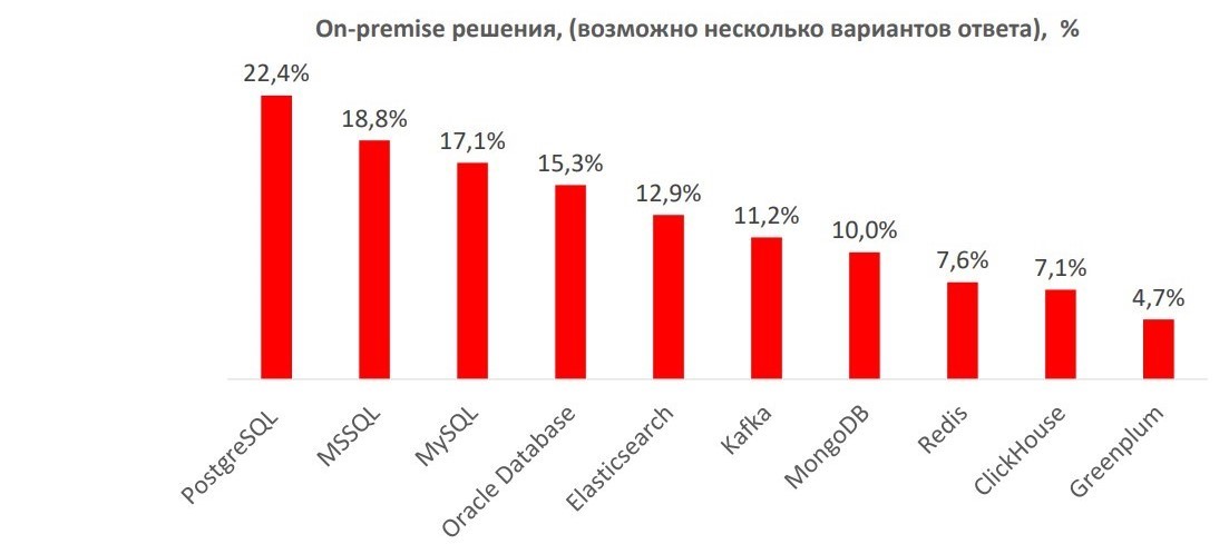 Заметно использование СУБД документоориентированных моделей: Elasticsearch (12,9%) и MongoDB (10%). Данные хранятся в форматах JSON (Elasticsearch) и BJSON (MongoDB). CУБД Redis (модель «ключ – значение») эксплуатируют 7,6% опрошенных.