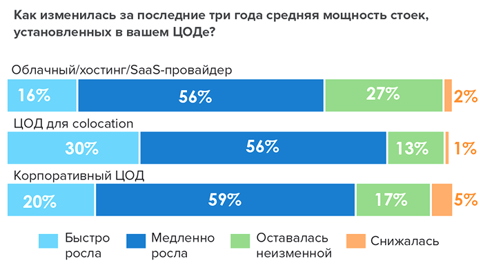 Согласно исследованию Global Data Center Survey 2023, проведенному Uptime Institute, хотя ИТ-стойки мощностью 4–6 кВт по-прежнему наиболее распространены, на объектах каждого пятого оператора ЦОДов стандартом становятся стойки, потребляющие 10 кВт и более. Более 70% респондентов заявили, что за последние три года мощность их стоек увеличилась (рис. 2).