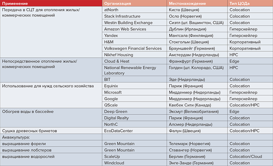 Тепло, выделяемое промышленным оборудованием, используется по-разному (см. таблицу). Сегодня наиболее популярна его подача в системы централизованного теплоснабжения. Несколько операторов СЦТ разработали бизнес-модели, которые предполагают закупку тепла, отводимого ЦОДами. Большинство из них действуют в Северной Европе, где климат стимулирует спрос на отопление жилых и коммерческих помещений. Там эти проекты имеют больший экономический смысл, а кроме того, устойчивое развитие важно как для бизнеса, так и для политиков.