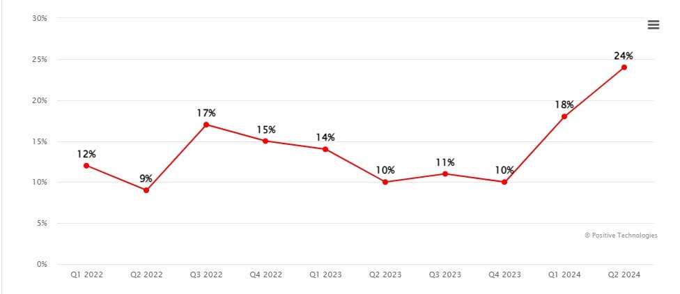 Хакерские атаки стали серьезным вызовом для бизнеса. Согласно сведениям Роскомнадзора, в 2023 г. произошло 168 утечек и в открытый доступ попало 300 млн записей. Информационно-аналитический центр InfoWatch насчитал 656 случаев утечек и 1,12 млрд записей. Многие утечки связаны с плохой организацией защиты, причем проблемы усугубляются. Согласно исследованию, проведенному Positive Technologies, первые два квартала 2024 г. показали аномальный рост числа утечек, связанных с кражей учетных данных, в организациях по всему миру. Их доля резко увеличилась в I квартале, а по итогам II квартала достигла рекордного уровня в 24% (см. рисунок). Иными словами, почти каждая четвертая утечка конфиденциальной информации – это раскрытие учетных данных.