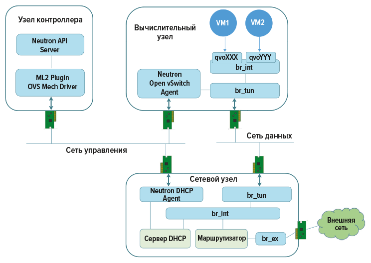 Мост br-tun в виртуальном роутере сервера отвечает за создание туннелей между виртуальными машинами и сетевыми устройствами на Network Node и оверлейных сетей (VXLAN), связывающих виртуальные машины на разных хостах (Compute Node). Управление виртуальным роутером (OVS) осуществляется с помощью установленного на хосте агента (Neutron Open vSwitch Agent), который загружает получаемые по сети управления (еще как минимум две сетевые карты на каждый сервер) настройки и таблицы маршрутизации от расположенного на Controller Node контроллера сети (Neutron API Server).