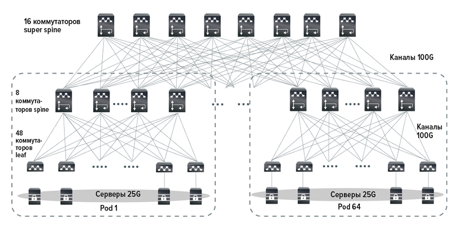Первое требование отражается в физической архитектуре сети. В отличие от трехуровневых систем, которые распространены в офисах и небольших корпоративных ЦОДах, в коммерческих ЦОДах, фокусирующихся на предоставлении облачных услуг, данные передаются преимущественно между серверами (горизонтальное направление, или «запад – восток»), а не от терминального устройства пользователя-человека к серверу и обратно (вертикальное, или «север – юг»). При этом задержки передачи сигнала критичны, что заставляет минимизировать количество промежуточных узлов сети. Это обусловило широкое применение в высокоскоростных сетях дата-центров двухуровневой архитектуры spine – leaf (технология Clos). Для обеспечения связи между отдельными модулями (pods) в машзале, между машзалами и даже ЦОДами добавляется еще один слой коммутаторов (super spine). При подключении к ним коммутаторов уровня spine используется тот же подход, что и уровнем ниже (рис. 1).