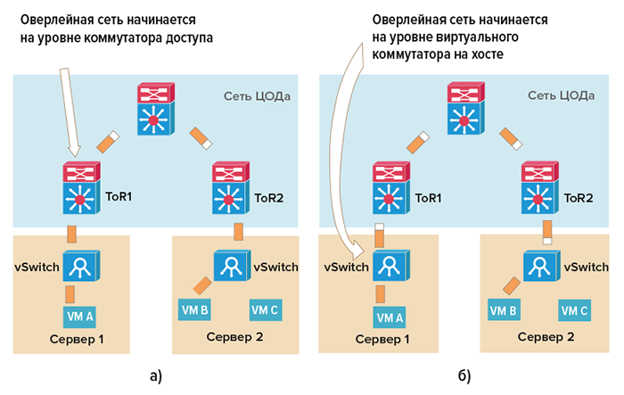 Рис. 5. Архитектура оверлейной сети, построенной на коммутаторах доступа (а) и на виртуальных роутерах (б)