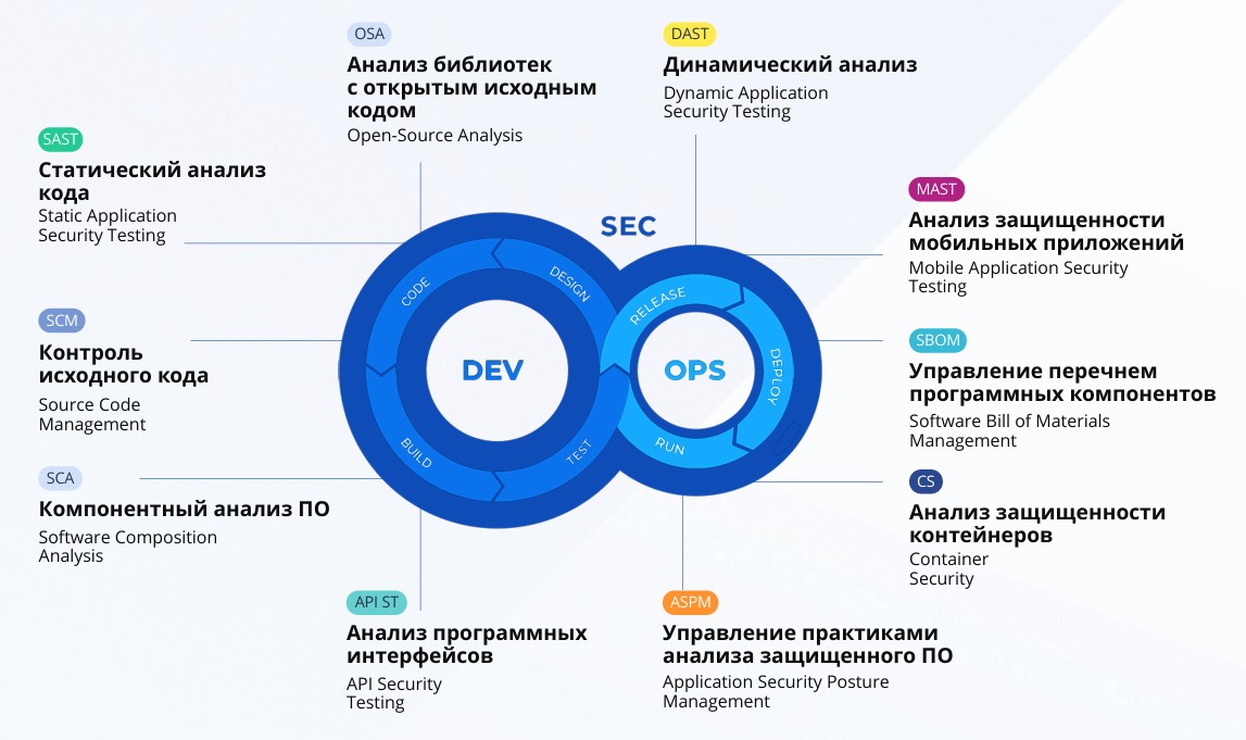 Изменились и методы проверки. Теперь это не только статический анализ (SAST), выполняемый на исходном коде приложения без его запуска, но и динамический (DAST), тестирующий рабочую программу. Стал использоваться компонентный анализ ПО (SCA), идентифицирующий сторонние и открытые компоненты, интегрированные в приложения, оценивающий риски их использования и соблюдения лицензионных требований. Проводится анализ используемых приложением библиотек с открытым исходным кодом (OSA) и программных интерфейсов (API ST).