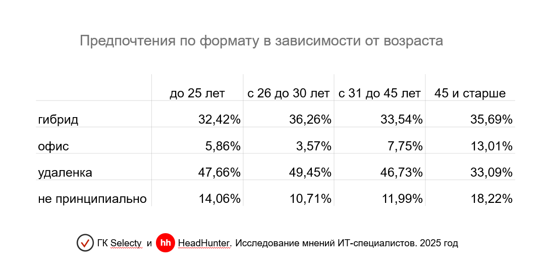 Чтобы точнее представить предпочтения, важно обратить внимание и на возраст кандидатов. Так, наиболее заинтересованы в удаленной работе специалисты в возрасте 26–30 лет (49%), в то время как среди профессионалов старше 45 лет таких всего 33,1%. При этом последние активнее голосуют за офисную работу (13%) и чаще называют формат несущественным вопросом (18,2%).