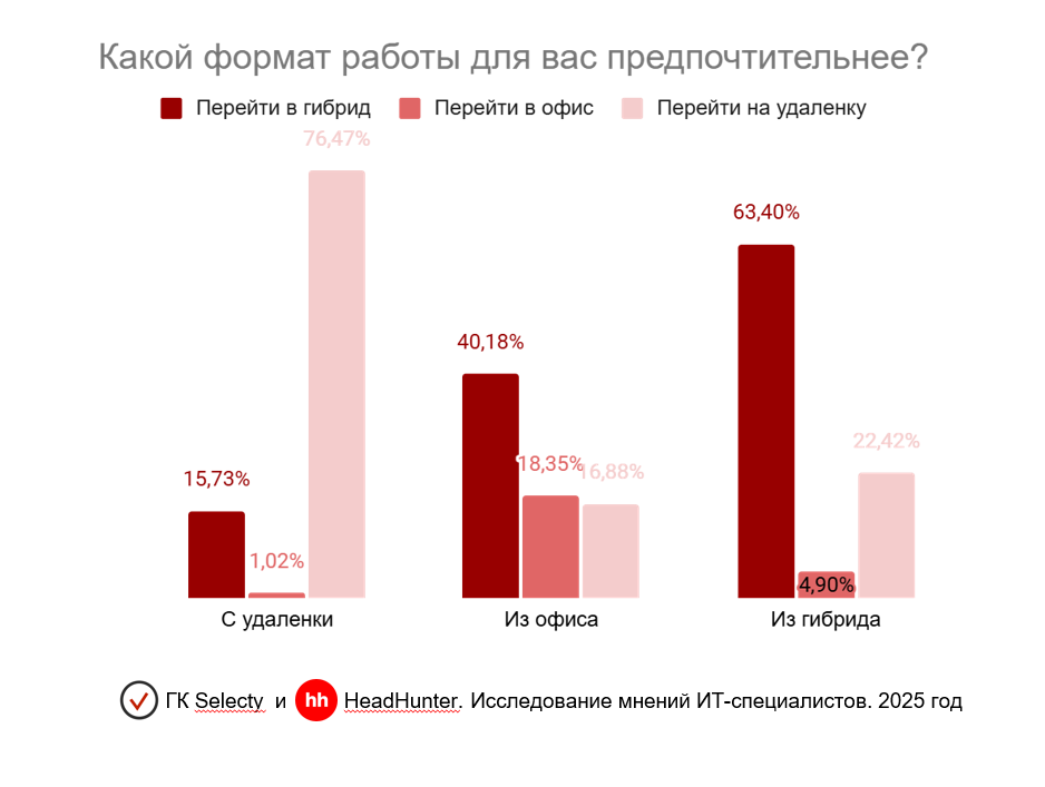 Почти 16% ИТ-специалистов, которые сейчас работают удаленно, хотели бы перейти на гибридный график. По данным совместного исследования ИТ-компании Selecty и платформы онлайн-рекрутинга hh.ru, формат работы входит у соискателей в число ключевых факторов при выборе места работы.