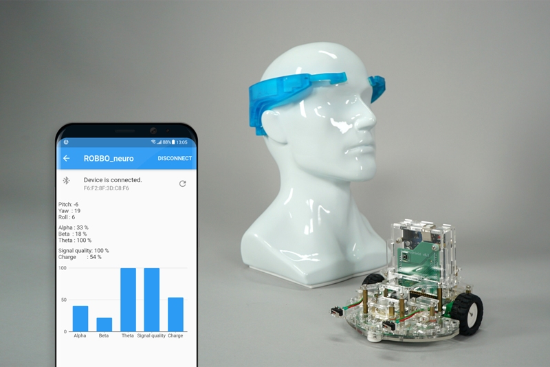 Разработанный аппаратно-программный комплекс представляет собой систему для снятия сигналов мозга и генерации их управляющего воздействия на внешнее устройство. Снятие, предварительная обработка и анализ сигналов производится на аппаратной части нейрогарнитуры (в виде обруча, который нужно надеть на голову), а управление роботизированной платформой осуществляется путем беспроводной передачи по Bluetooth с использованием BLE модуля. Для связи и транслирования команд реализовано собственное приложение на OS Android, обеспечивающее прием и передачу данных от гарнитуры к устройству.