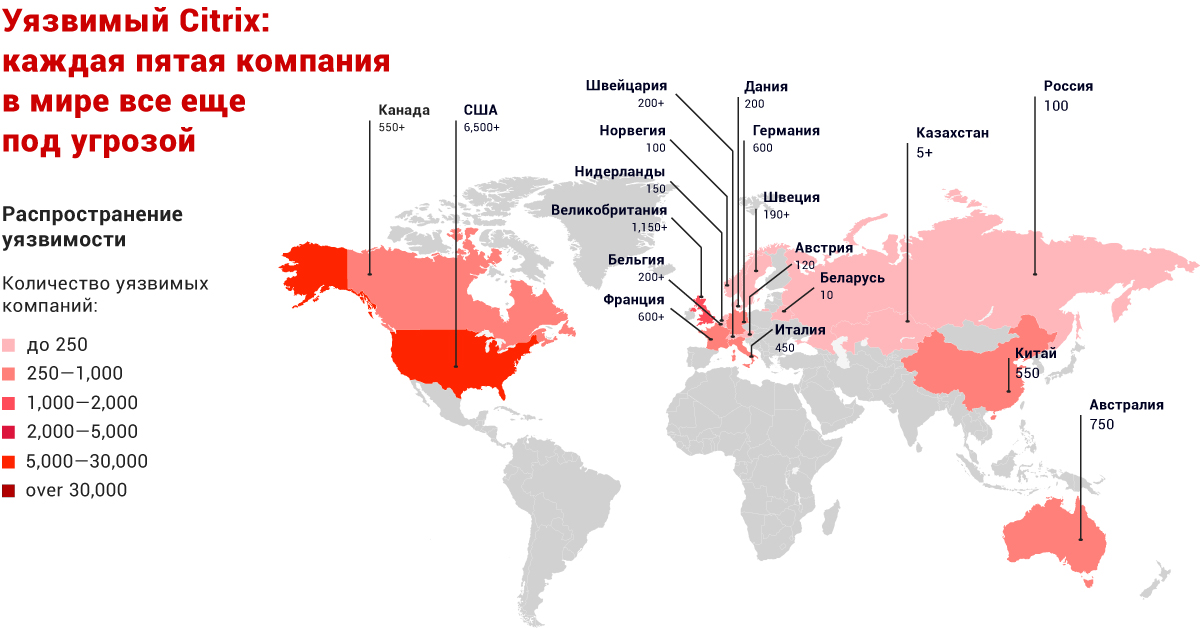 Спустя полтора месяца после публикации Positive Technologies информации о критически опасной уязвимости в ПО Citrix, угрожавшей 80 тысячам компаний в 158 странах, каждая пятая компания все еще не приняла меры для устранения уязвимости. Это следует из данных мониторинга актуальных угроз, который проводит компания Positive Technologies.