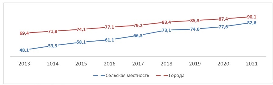За 2013-2021 гг. доля охвата интернетом на селе устойчиво росла. В 2013 году только менее половины жителей села имели доступ в сеть, тогда как к 2021 году охват населения сетью возрос до 82,6%. Рывок в охвате на треть сельского населения был проделан всего за 8 лет, несмотря на высокую дифференциацию доступности сельских населенных пунктов по территории страны, в том числе с учетом отдаленных районов Крайнего Севера и приравненных к ним. Разрыв в обеспеченности городской и сельской местности подключением к сети сократился с 21,3 до 7,5 процентного пункта.