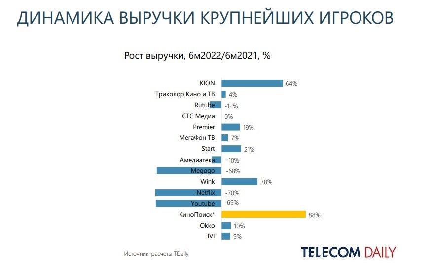 Отсюда зарубежные компании демонстрируют падение общей выручки (70% — у Netflix, 69% — у YouTube и 68% — у Megogo), а специализирующаяся на зарубежном контенте «Амедиатека» потеряла 10%. RuTube, видимо, из-за технических проблем также лишился 12% выручки.