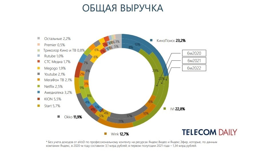 Идущие пятым и шестым Start (5,7%) и Kion (5,5%) также подросли — соотвественно 5 и 4% годом ранее. А вот Netflix (годом ранее — 9%), YouTube (тогда же — 7%) и Megogo (6%), напротив, снизили выручку до 2-2,5%. Оставшиеся цифры — это доля ранее оплаченных подписок. Даже присутствующий на российском рынке YouTube отменил монетизацию и не оказывает платные услуги.